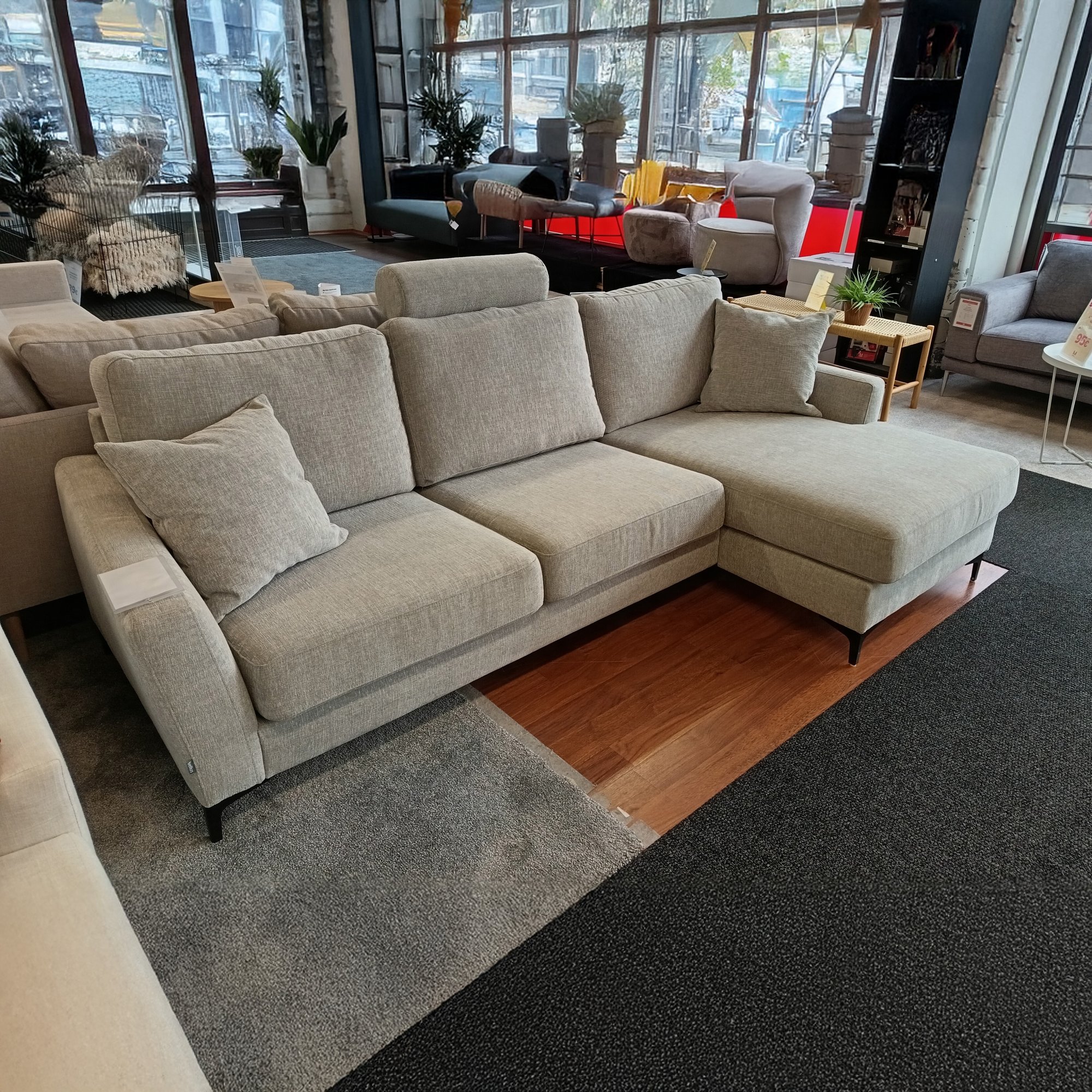 Käännettävä kätisyys, irrotettavat päälliset, puurunko, uudenveroinen. Mitat: leveys 253cm, div. syvyys 144cm, korkeus 86cm