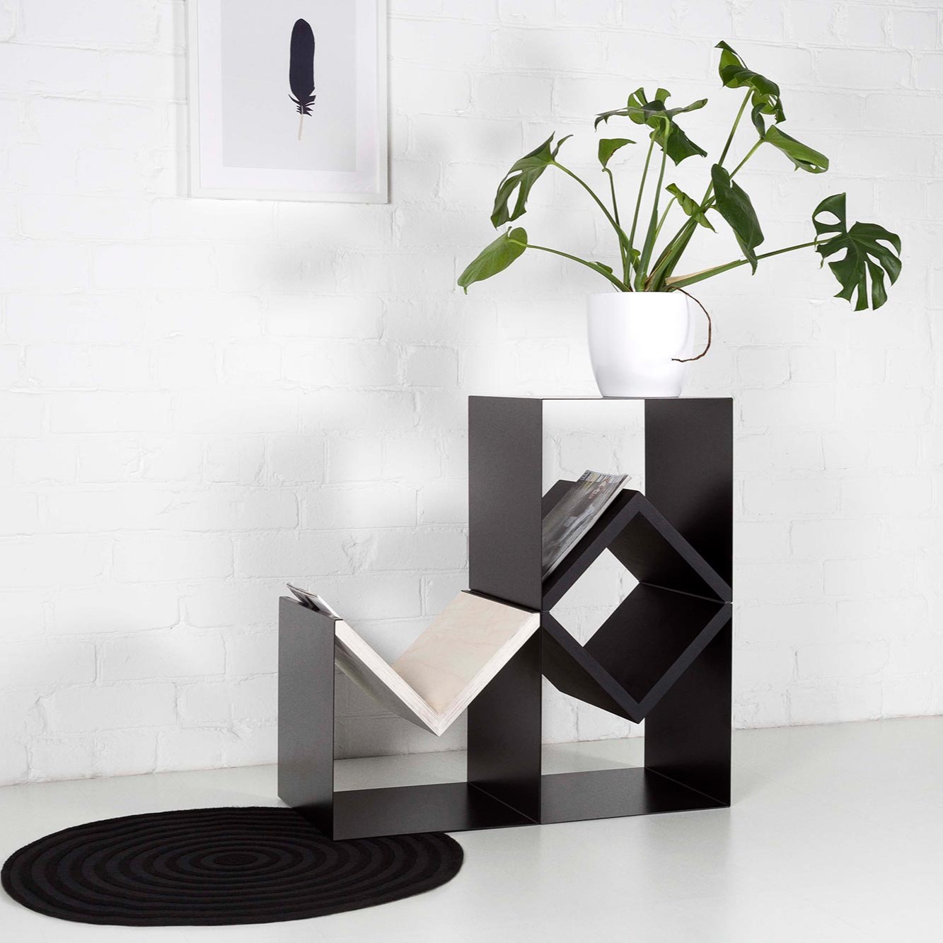 Sivupöytä on väriltään musta. Pöytä on valmistettu koivuvanerista ja teräksestä.