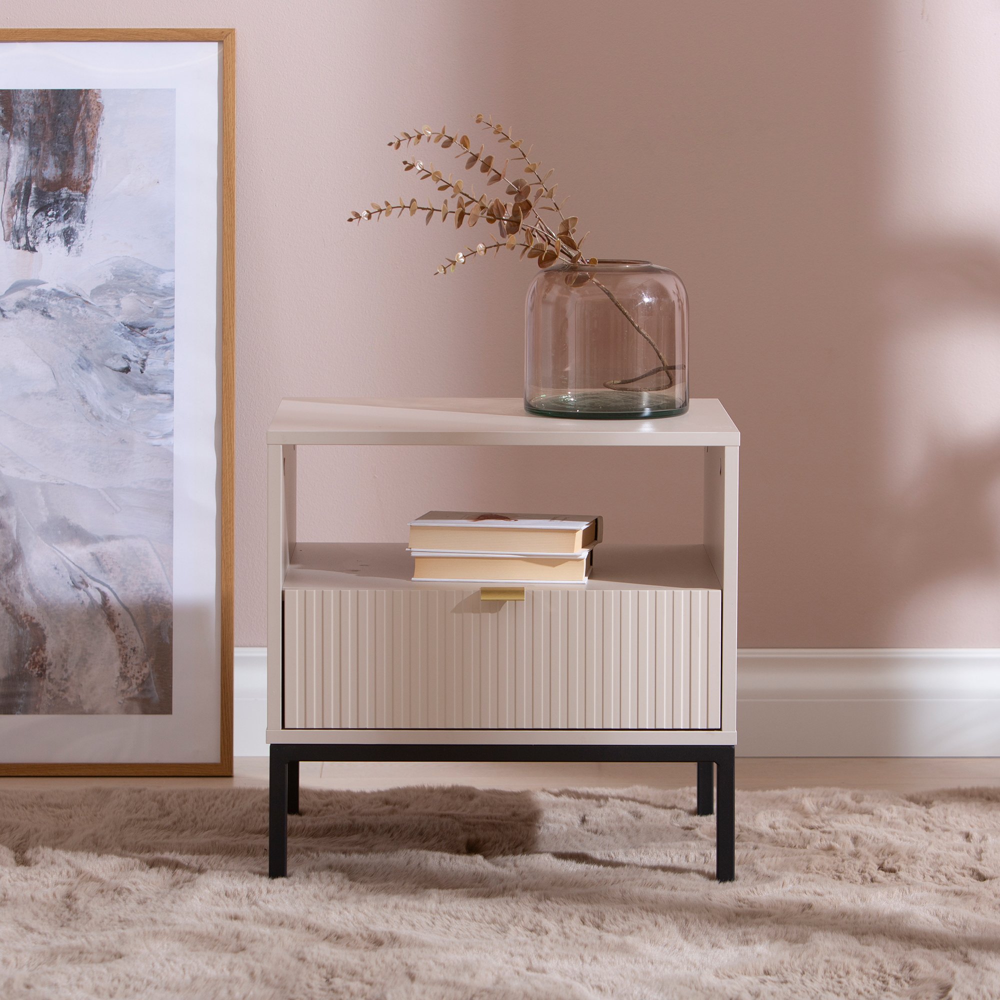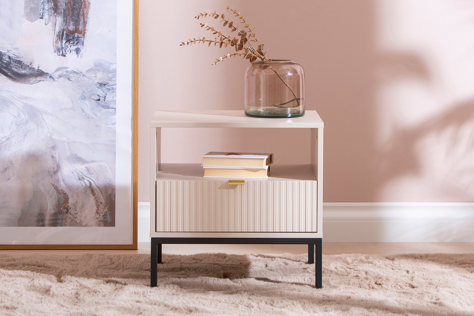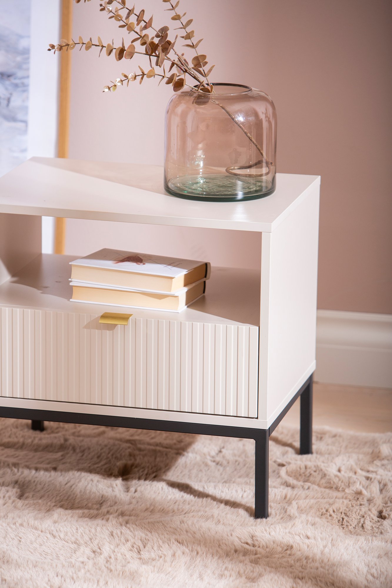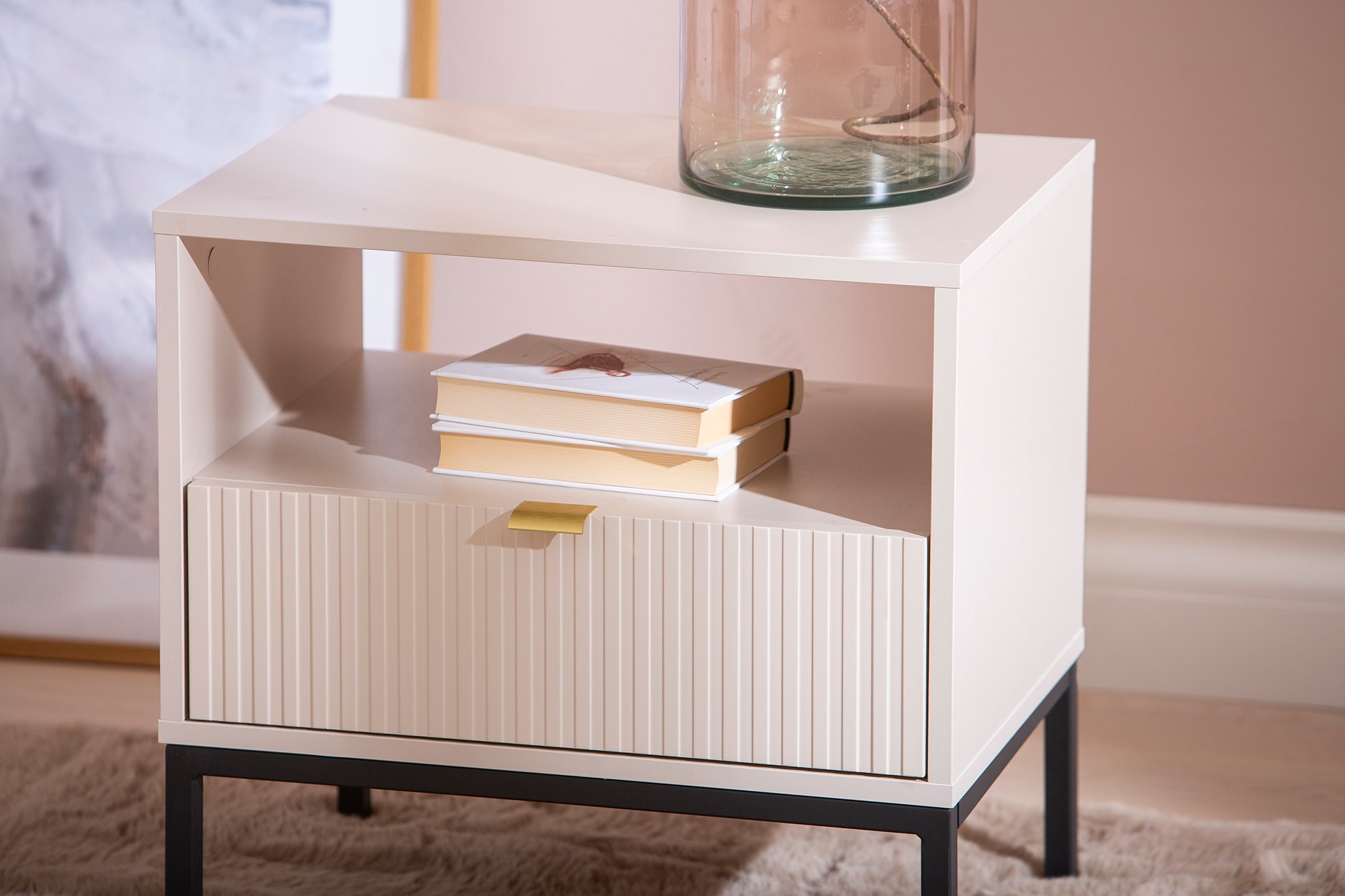 Yöpöydän runko on valmistettu beigestä kalustelevystä ja mustat metallijalat korostavat yöpöydän modernia ilmettä. Yöpöydän kullanväriset vetimet lisäävät ripauksen luksusta ja hienostuneisuutta. Caisa yöpöydässä on käytännöllinen laatikko, joka tarjoaa säilytystilaa kirjoille, silmälaseille ja muille henkilökohtaisille esineille. Laatikon ansiosta voit pitää yöpöydän pinnan siistinä ja järjestyksessä.