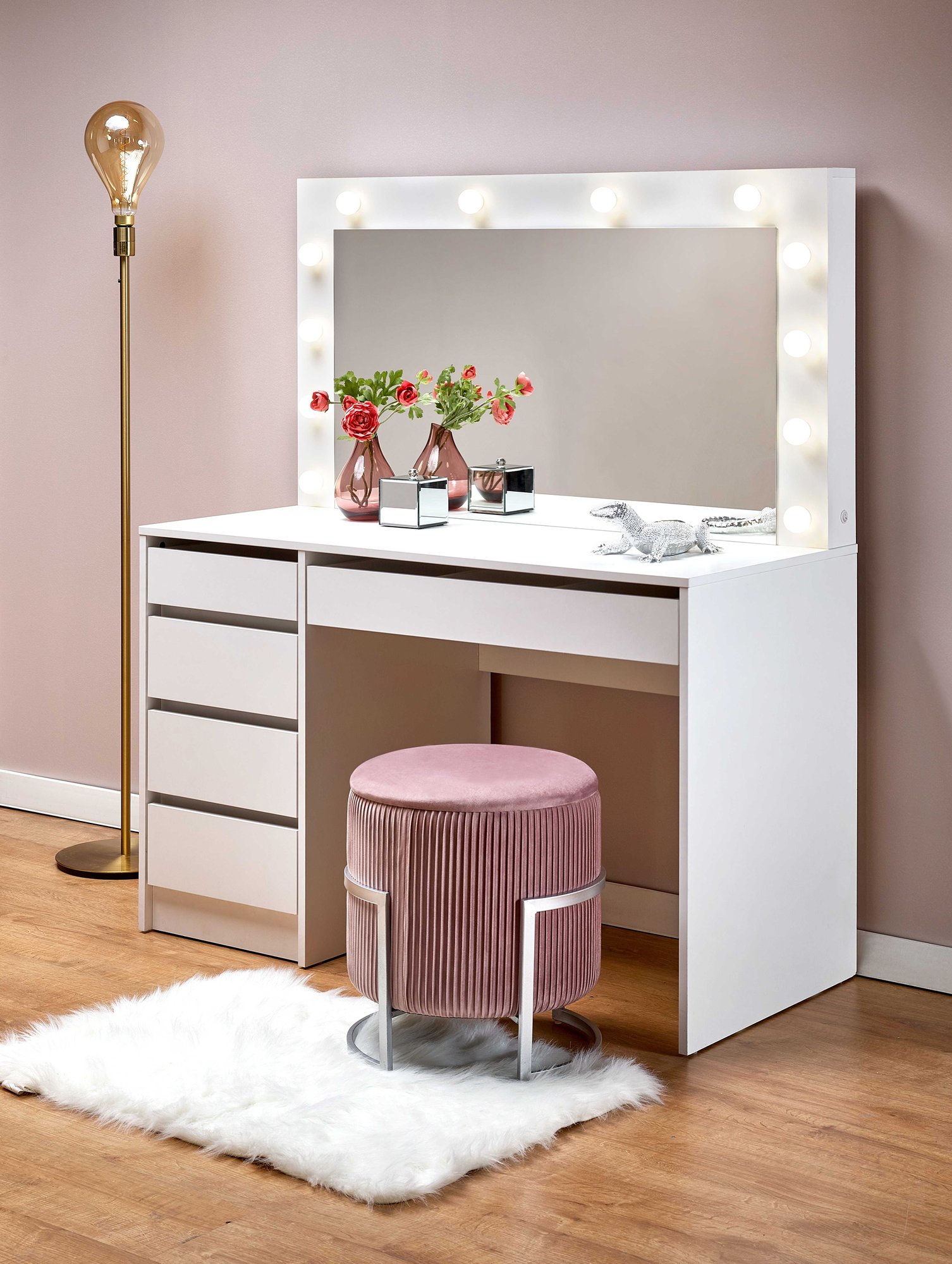 Hollywood kampauspöytä XL on moderni ja tilava valkoinen säilytysratkaisu makuuhuoneeseen tai meikkipisteeseen. Valmistettu kestävästä kalustelevystä ja MDF:stä, sisältää viisi vetolaatikkoa sekä suuren peilin valkoisella kehyksellä ja kirkkailla Hollywood-tyylisillä valoilla. Skandinaavinen ja tyylikäs design yhdistää käytännöllisyyden ja eleganssin, täydentäen kauniisti sisustustasi.